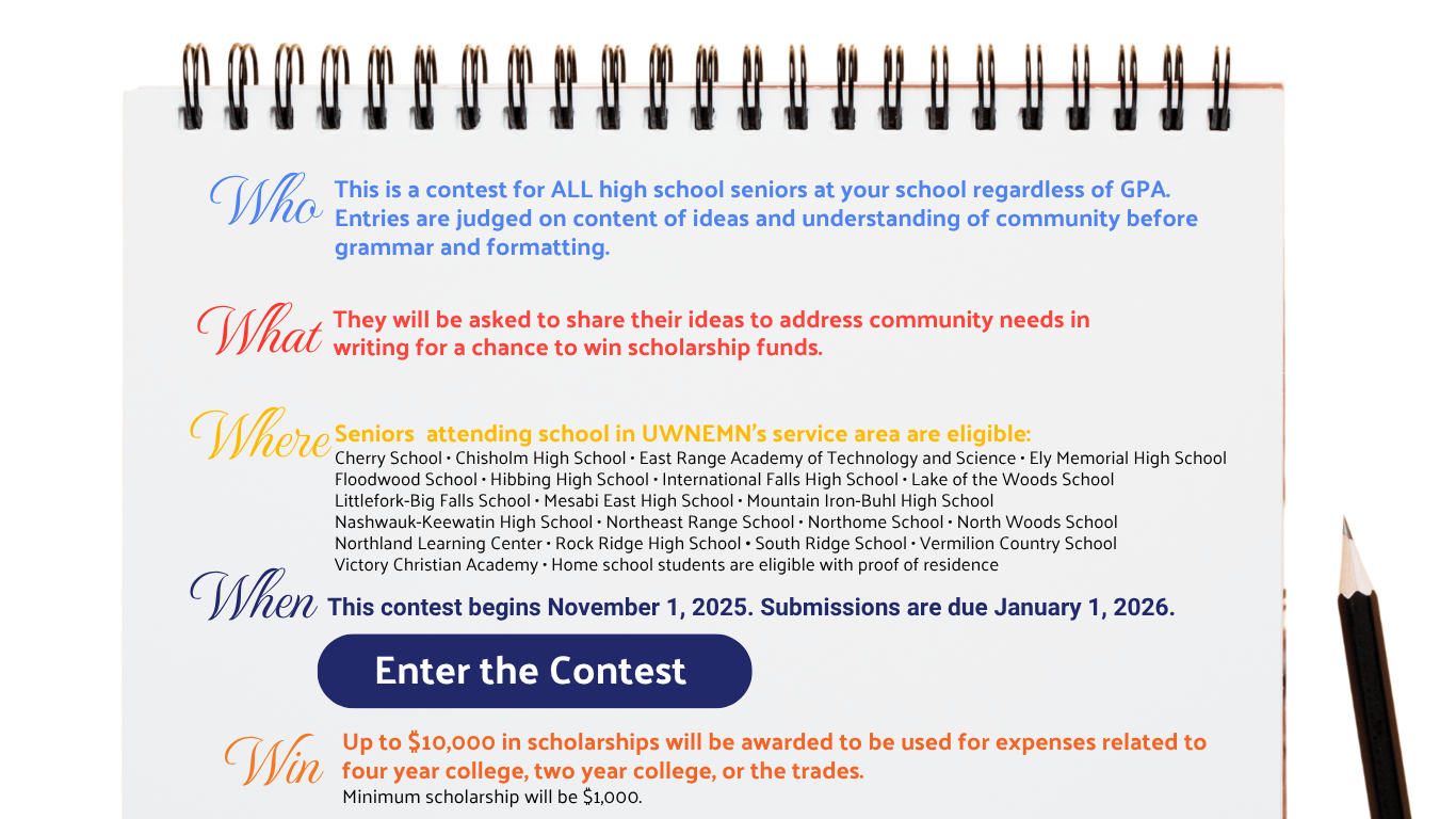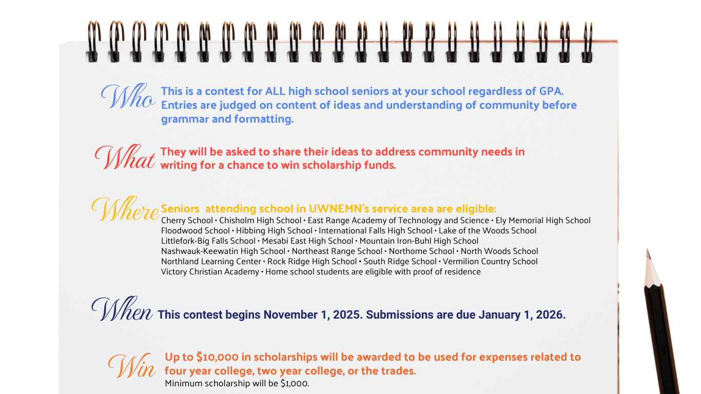 1. Contestants must be a senior in high school in United Way of Northeastern Minnesota (UWNEMN)’s service area (Iron Range, Koochiching County, Lake of the Woods County). Home school students are eligible with proof of residence.